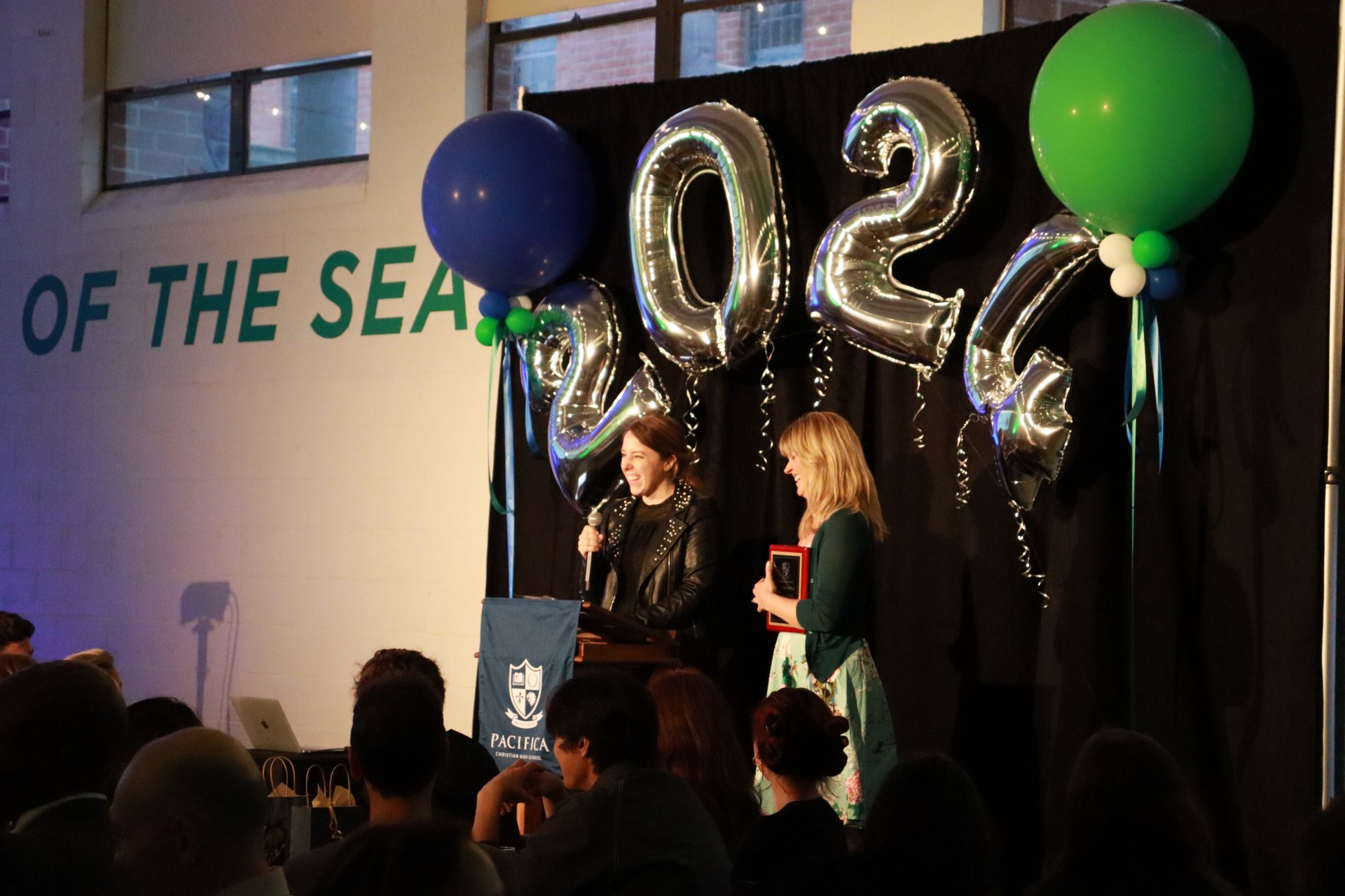 Katie Savage has been one of our beloved Pacifica English teachers for six years. At this year’s Senior Dinner, she was presented with our Faculty Member of the Year award. Her coworker and good friend, as well as last year’s Faculty Member of the Year, Hilary Miller presented Mrs. Savage with this well-deserved award. This award is given to a faculty member who demonstrates a deep commitment to Pacifica’s mission and excellence in creating a successful learning environment. Katie does both of these things with ease. Read on to hear more thoughts from Pacifica staff members on why Mrs. Savage is deserving of this year’s Faculty of the Year Award.