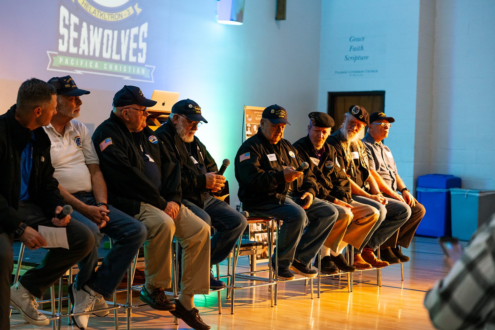 Amidst the pep rally and spirit activities on Friday, the main event was our Seawolf Luncheon. Several members of the original Seawolf veterans spent the afternoon on campus, first for a presentation to the student body and then to connect with staff and students over lunch. Some of the veterans even flew in from out of town for the event! Students watched videos telling the history of the Seawolves, and then engaged in a Q&A with the vets about their experiences. Much of the conversation surrounded the strong brotherhood between the men who served as Seawolves, as well as their commitment to honor. It was clear that students were deeply appreciative of their service and presence at our school, and that the veterans were excited to speak with them as well. Many staff members at Pacifica have mentioned this as the “highlight of the week.”