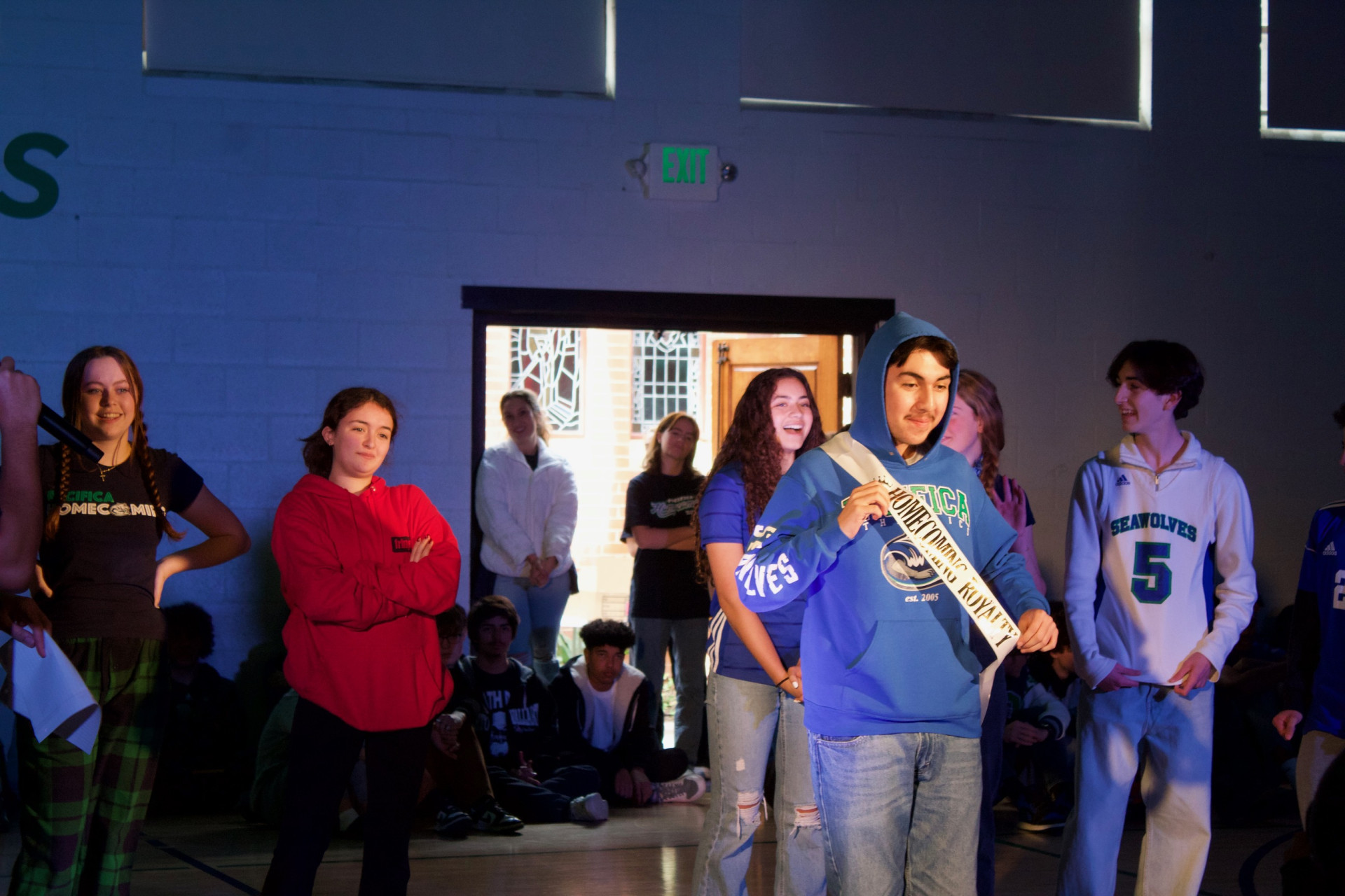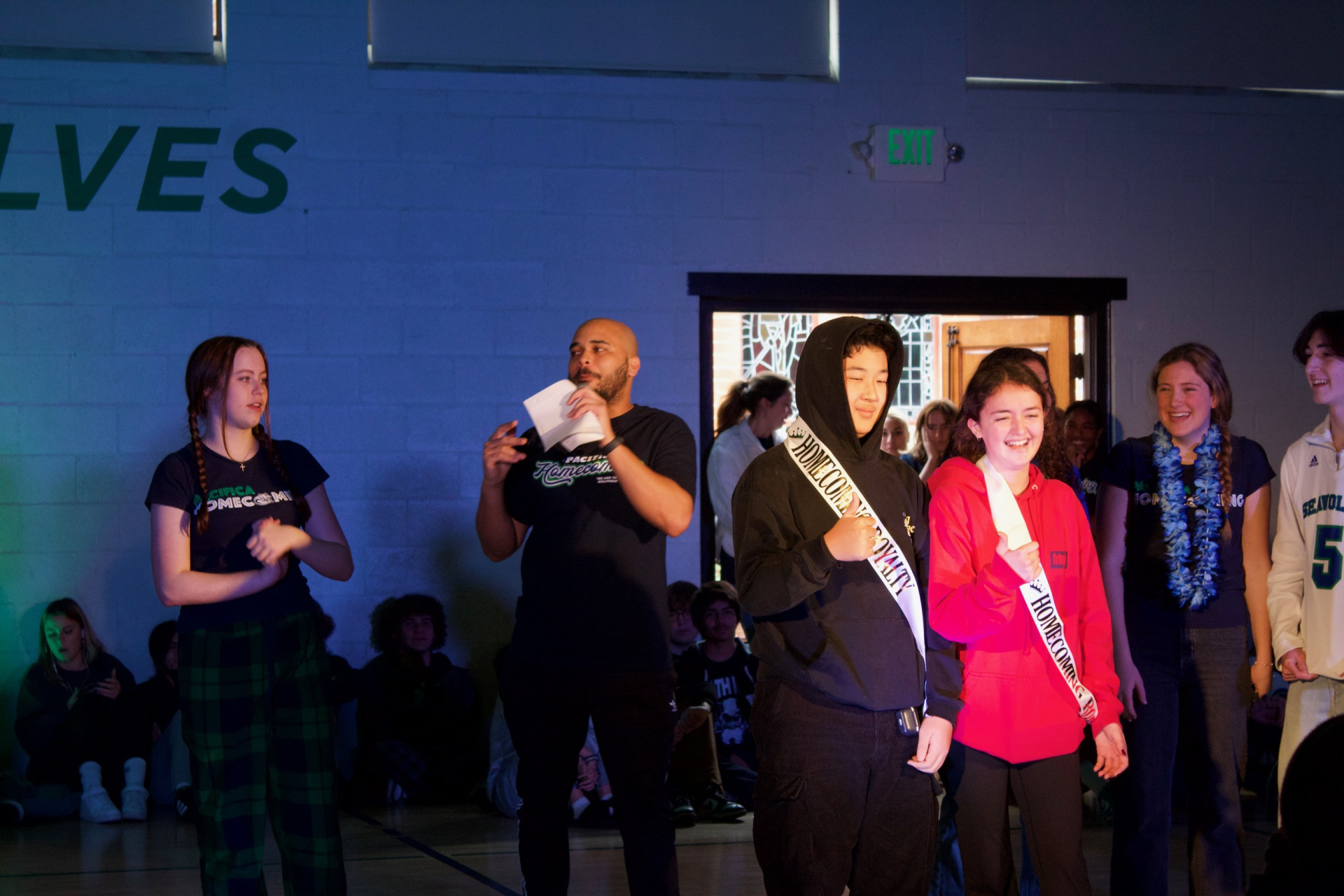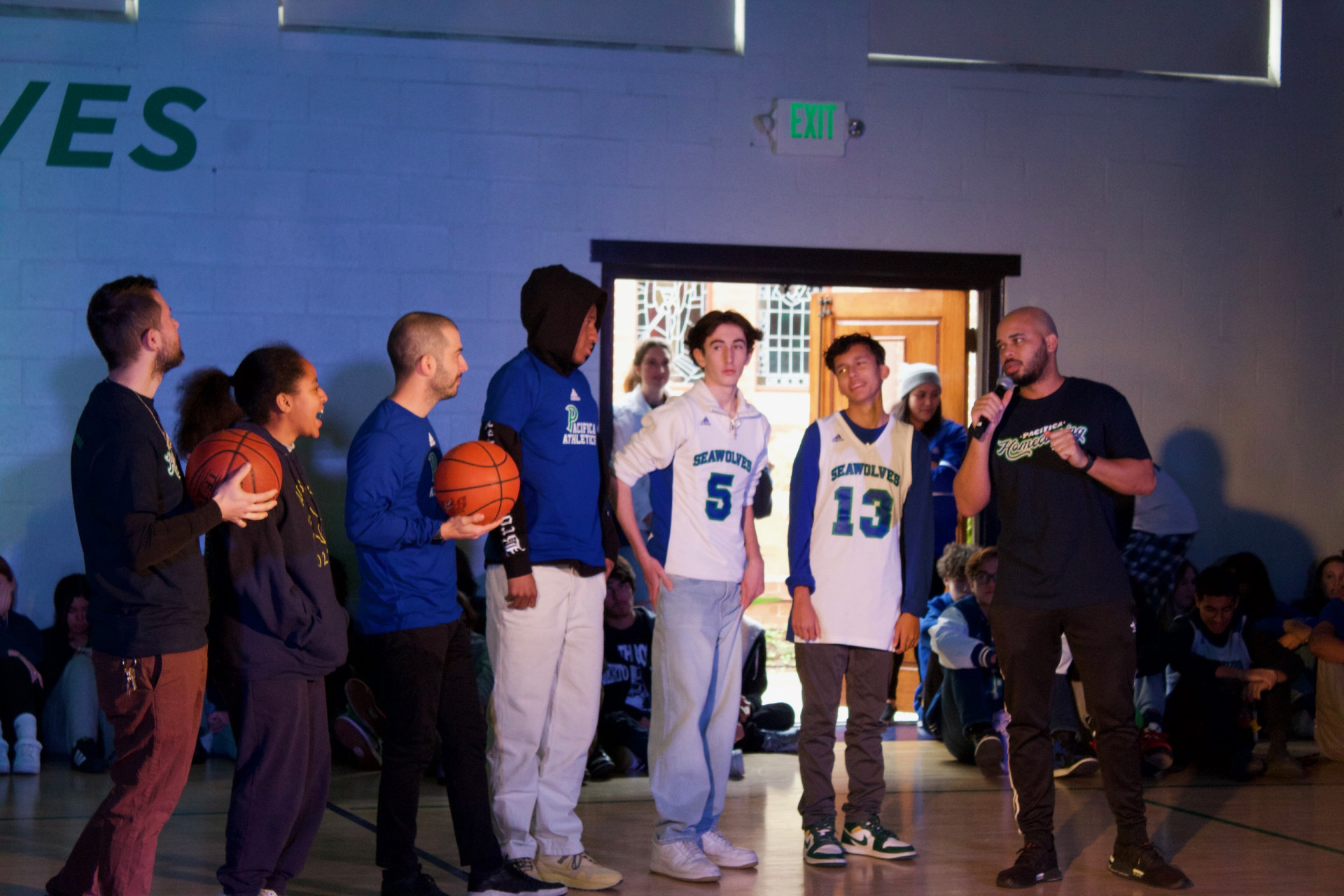 On Friday, everyone came to school decked out in Seawolf colors for Spirit Day and our homecoming pep rally during an extended lunch. Students, faculty, and staff piled in the gym to watch a three-point shootout between students representing each grade, with the finalist having the chance to face off against Pacifica math teacher Mr. Benedetto and win a prize for their entire class. Freshman Jude Toren put up a good fight, but ultimately Mr. B was victorious.